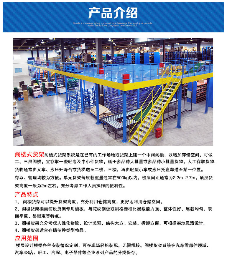 閣樓式貨架系統(tǒng)是在已有的工作場地或貨架上建一個(gè)中間閣樓,以增加存儲(chǔ)空間,可做二、三層閣樓,宜存取一些輕泡及中小件貨物,適于多品種大批量或多品種小批量貨物,人工存取貨物.貨物通常由叉車、液壓升降臺(tái)或貨梯送至二樓、三樓,再由輕型小車或液壓托盤車送至某一位置。 近幾年多使用冷軋型鋼樓板,它具有承載能力強(qiáng)、整體性好、承載均勻性好、精度高、表面平整、易鎖定等優(yōu)勢.有多種類型可選,并且易匹配照明系統(tǒng),存取、管理均較為方便。單元貨架每層載重量通常在500kg以內(nèi),樓層間距通常為2.2m~2.7m,頂層貨架高度一般為2m左右,充分考慮工作人員操作的便利性。 樓層設(shè)計(jì)根據(jù)各種安裝情況定制,可在現(xiàn)場輕松裝配,無需焊接。閣樓貨架系統(tǒng)在汽車零部件領(lǐng)域、汽車4S店、輕工、電子等行業(yè)有較多應(yīng)用。