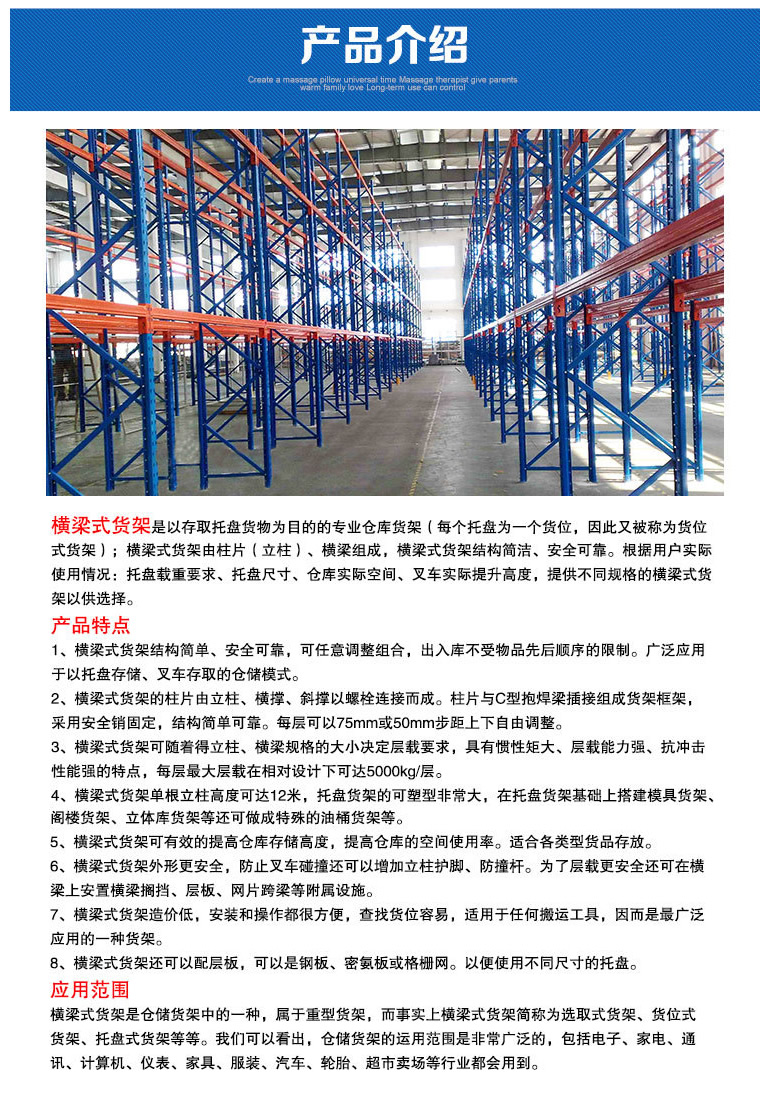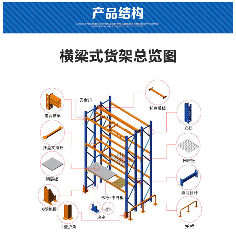 重型貨架,又俗稱橫梁式貨架,或稱貨位式貨架,屬于托盤貨架類,在國內(nèi)的各種倉儲(chǔ)貨架系統(tǒng)中最為常見一種貨架形式。以立柱片+橫梁形式的全組裝結(jié)構(gòu),結(jié)構(gòu)簡明有效。可根據(jù)存儲(chǔ)單元集裝設(shè)備的特性加裝如:隔檔、鋼層板(木層板)、金屬絲網(wǎng)層、倉儲(chǔ)籠導(dǎo)軌、油桶架等功能性附件。滿足不同單元集裝設(shè)備形式的貨物存儲(chǔ)。